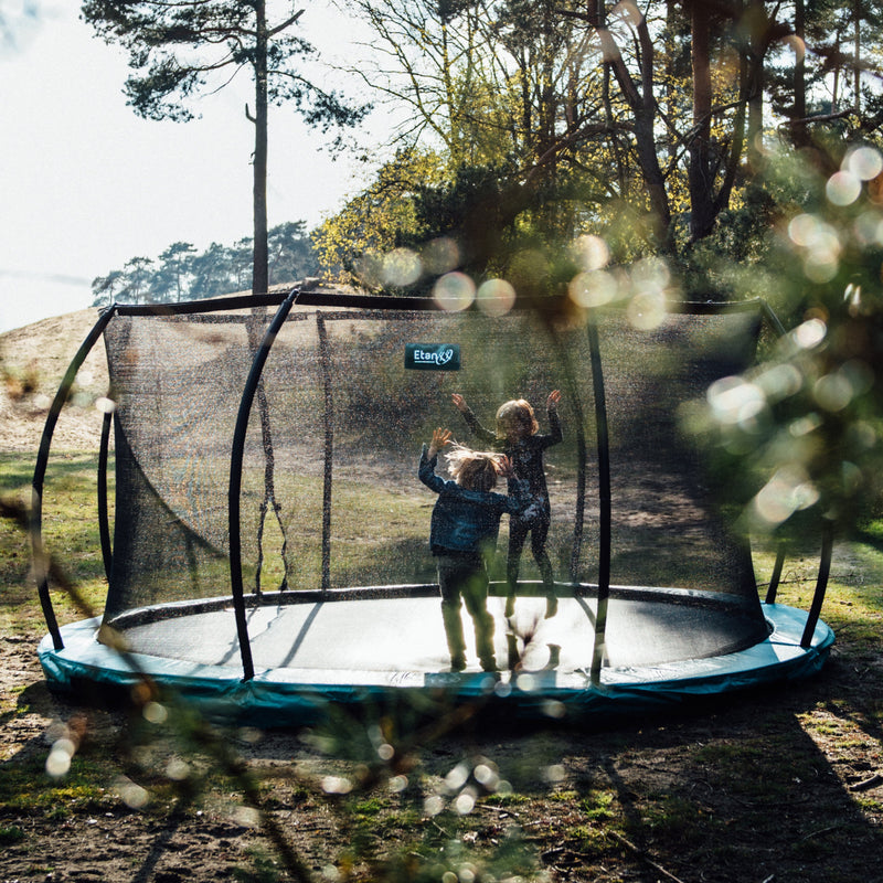 A trampoline jump mat – also called a trampoline mat – is the part you actually jump on. Etan uses only high-quality Permatron material for its jump mats. This fabric is known for its strength, UV resistance, and lightweight properties. For the Etan OptiFlow trampoline jump mat, PVC is used, which creates an open structure allowing air to pass freely while jumping. This results in a tighter, more responsive bounce. The OptiFlow mat comes standard with our Etan UltraFlat and Etan PremiumFlat trampolines.