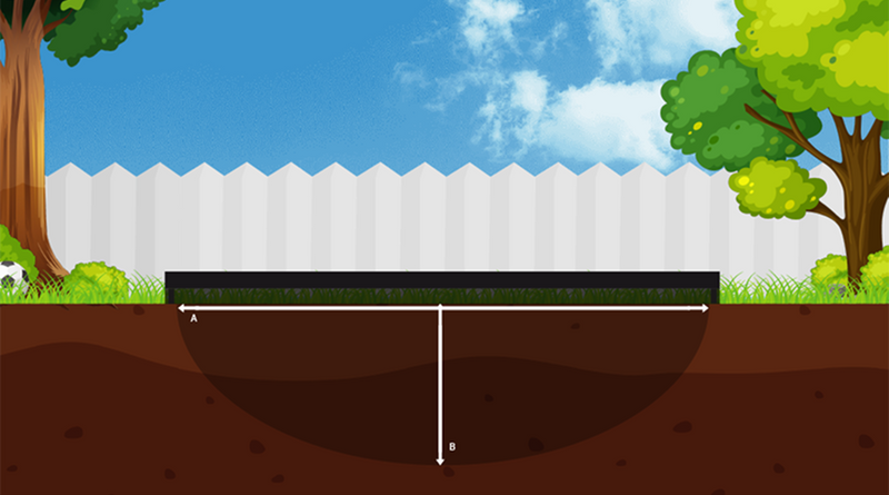 Did you measure and draw the hole where you want the trampoline? Well done! It is now important that you dig to the deepest point of the trampoline. This deepest point should be in the exact centre of the hole to be dug. Start digging here and try to dig your way out from a deep point. This way, you will have a good result and you don’t need to reinforce the wall unnecessarily. For the dimensions of the hole and the deepest point, you can use the illustrations below.