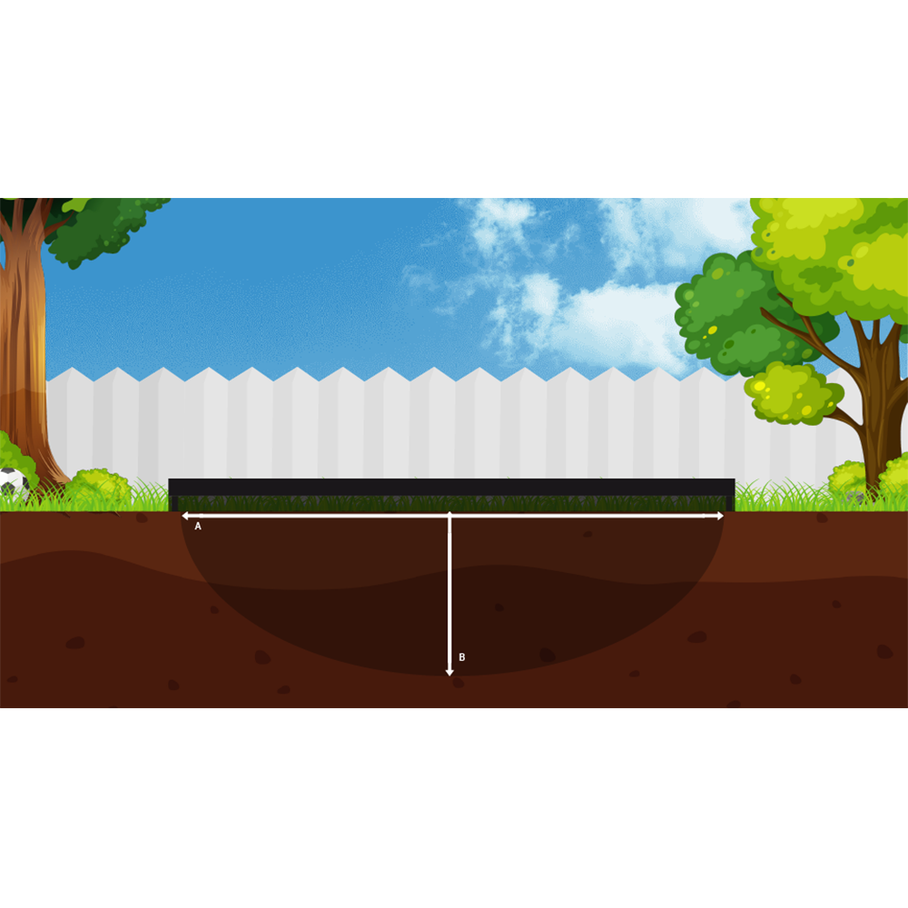 Avez-vous mesuré et marqué le trou où vous voulez installer le trampoline ? Excellent travail ! Il est maintenant important que vous creusiez jusqu’au point le plus profond du trampoline. Ce point le plus profond doit se trouver au centre exact du trou à creuser. Commencez à creuser ici et essaie de vous extraire d’un point profond. De cette façon, vous obtenez un bon résultat et vous n’avez pas besoin de renforcer le mur inutilement. Pour les dimensions du trou et du point le plus profond, vous pouvez utiliser les illustrations ci-dessous.