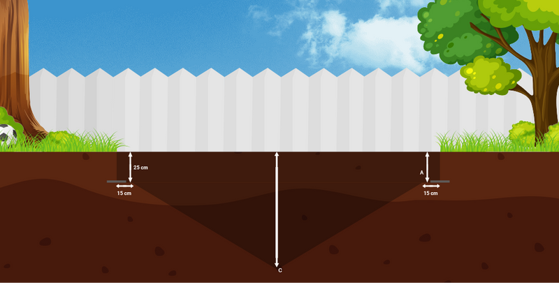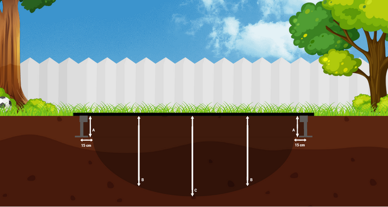 Stel je hebt een Etan PremiumFlat trampoline van 310 x 232 cm. Deze heeft een minimaal dieptepunt in het midden van het gat van 95 cm. Je graaft vanaf dat punt naar buiten. Zorg dat je op de op punt B (zoals aangegeven in de afbeelding hiernaast) op ongeveer 2/3 van de totale diepte zit. Dus voor ons voorbeeld, op ongeveer 55 cm diep. Het graven van een gat is geen moeilijke rekensom, maar het is wel belangrijk dat je altijd eerst even test of je de juiste diepte hebt gegraven voordat je de kinderen erop laat springen. Doe dit door zelf, op alle plekken van de trampoline even goed op en neer te springen. Raak je de bodem niet? Heb je vertrouwen dat het gat diep genoeg is? Zo niet, graaf dan nog een extra beetje zand weg. We adviseren altijd om worteldoek in het gat te plaatsen, dit voorkomt het meeste onkruid in de kuil. Nu is het gat klaar en kun je de trampoline plaatsen. Je UltraFlat trampoline staat nu in het gat, je kunt nu de wandconstructie plaatsen en de trampoline beschermrand bevestigen. Volg de handleiding stap voor stap. Hier zijn ook bovenaanzichten aanwezig. Alvast veel springplezier!